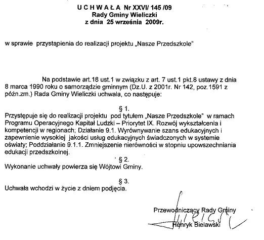 Uchwała Nr XXVI/145/09 w sprawie przystąpienia do realizacji projektu "Nasze Przedszkole" (w załączniku)